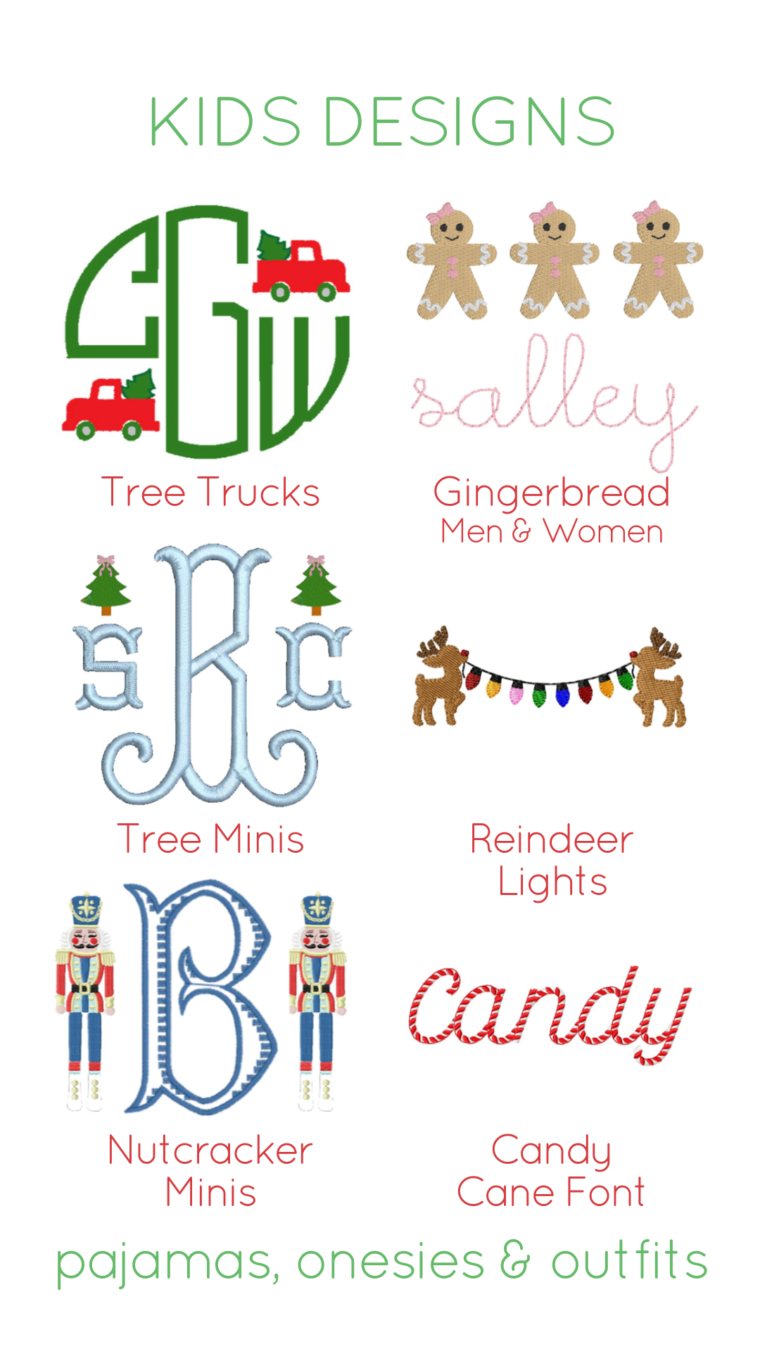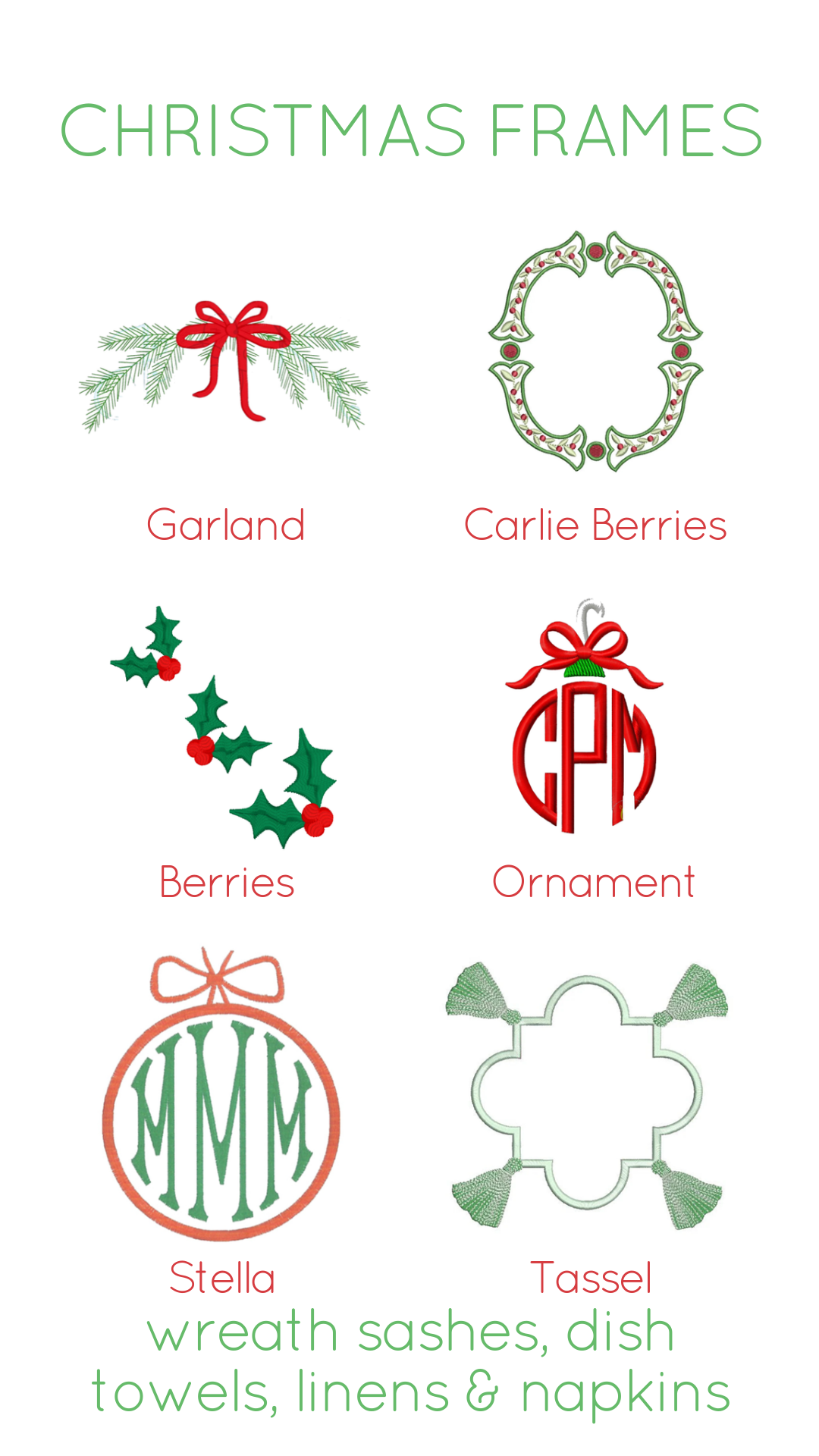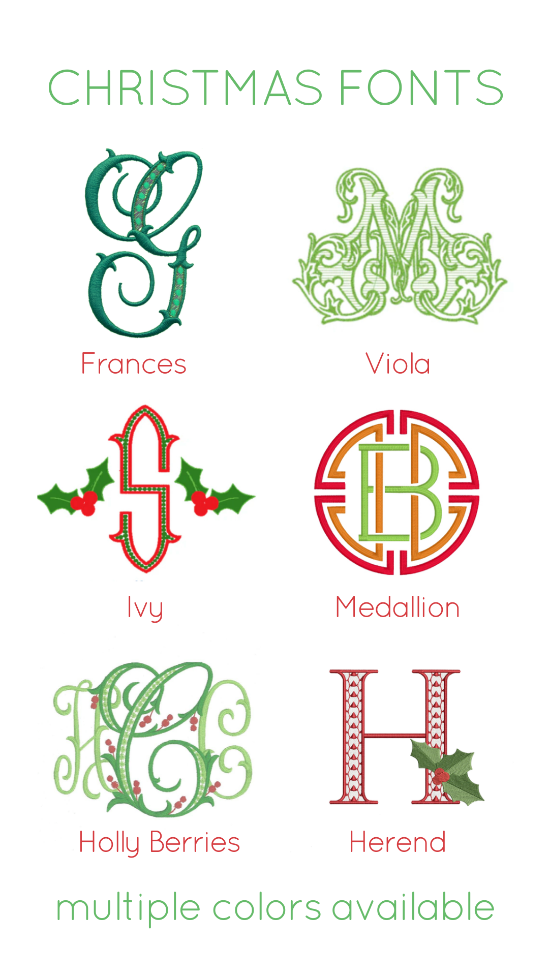 Stockings: Stocking fonts and examples can be found on Instagram under the ‘Christmas’ highlight. (These fonts are practically endless.) Please do not ask us for stocking and holiday examples; we do not take many pictures because we are busy processing orders. In order to add to stocking to a collection, clients must provide a sample stocking to accurately measure and match the font. We will not accept pictures. Clients must provide at least two stockings: one example and one new. Some stocking examples can be found in our Christmas Highlight.