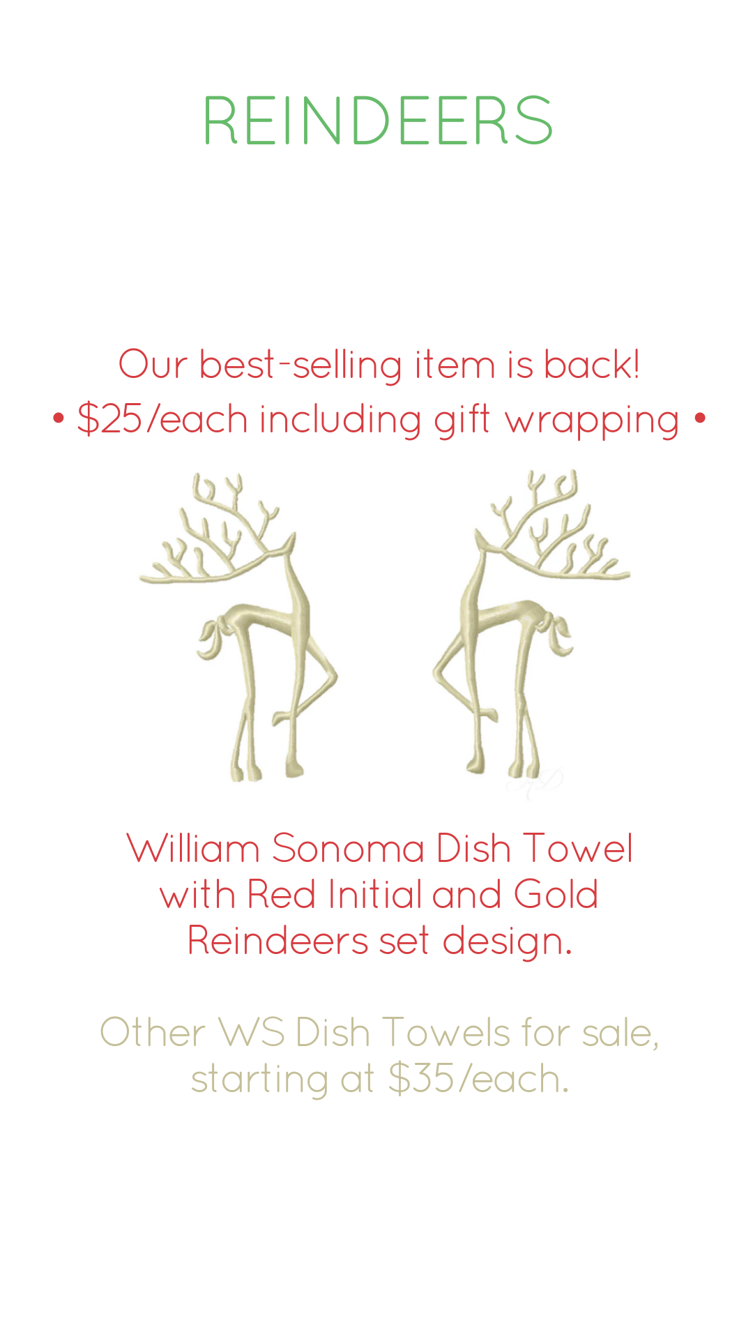 Available For Purchase: William Sonoma Dish Towels (Reindeer $25 and Others $35+), white Cocktail Napkins and white Linens. Message for more pricing and details.