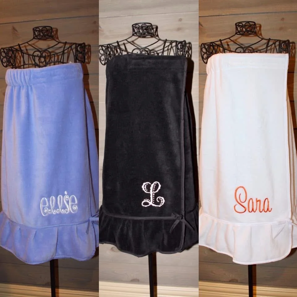 Popular For Girls: We recommend satin pillowcases, towel wraps, robes, towels, hair wraps, cosmetic bags, bandanas, and pajamas. For girls, we typically embroider tradition monograms or first names in a variety of fonts. We recommend Lawrence’s in Fort Worth for girl gifts.